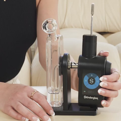 Transform your Stündenglass Modül into a versatile handheld device with the Modül Dok. Featuring 3mm borosilicate glass, a 4 hole welded stem percolator, and an anodized aluminum stand, the Dok attaches seamlessly to the Modül via a standard Stündenglass magnetic adapter to create a powerful all in one device with robust heating options for concentrates or dry material through interchangeable tanks that can reach temperature in as little as 15 seconds. A 90° USB-C charging cable allows for simultaneous charging and use thanks to easy access to the Modül charging port.